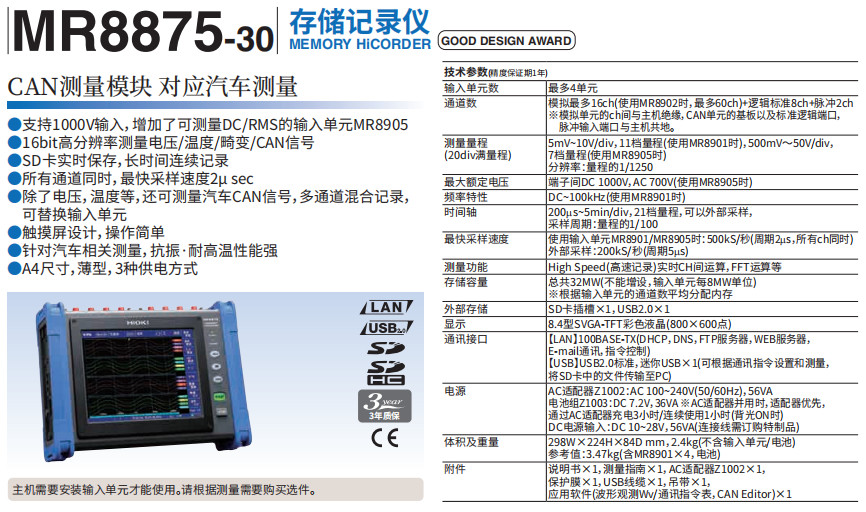 存储记录仪MR8847A能够所有通道都以20MS/s(分辨率50ns)的多通道、高速采样率进行测量。
